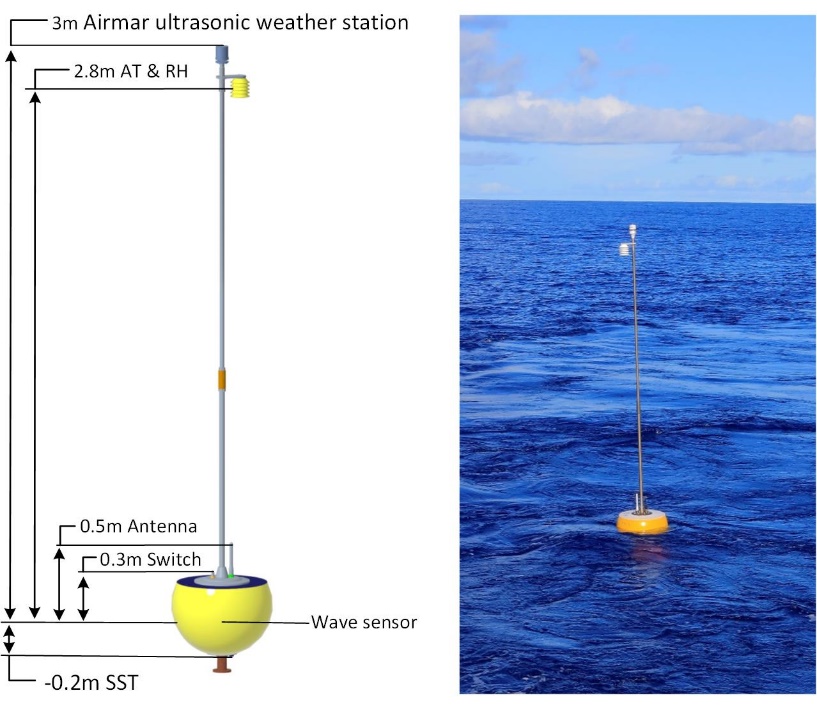 圖1 漂流式海氣界面浮標結構示意圖(左)與現場觀測圖(右)