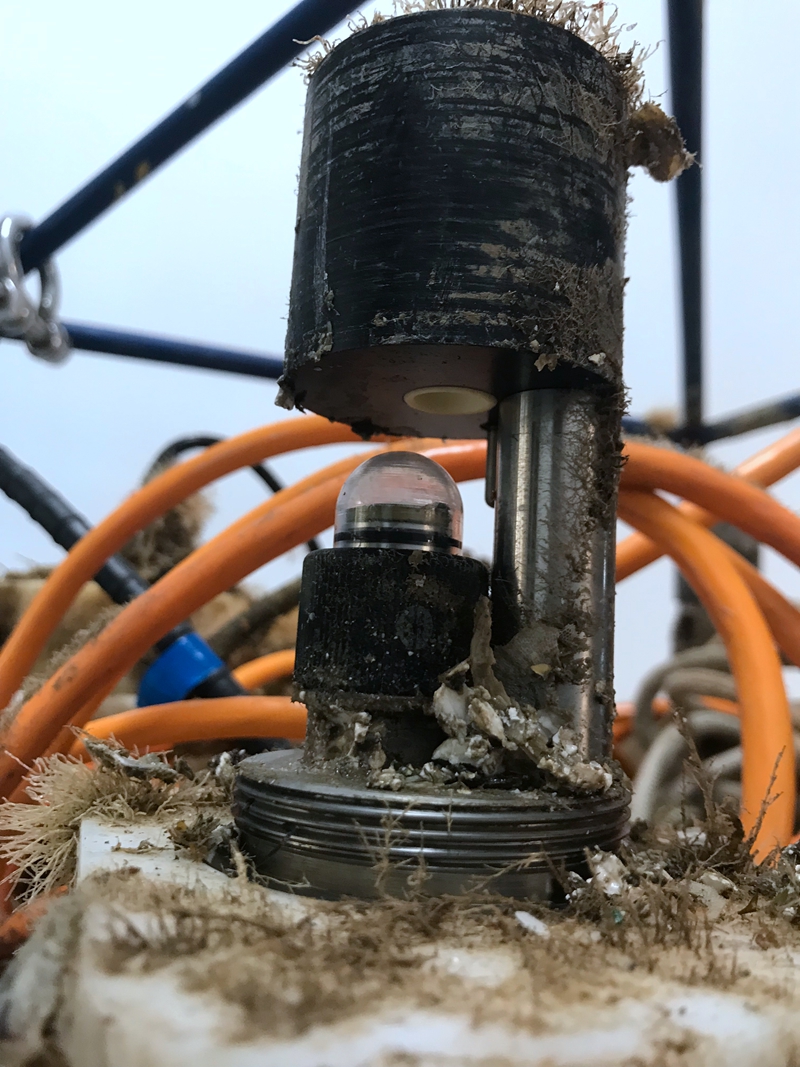 可見,夏季海表面生物附著現象嚴重,比測架和儀器外殼部分被生物覆蓋。而在銅網保護區內無海洋生物生長,防護銅網的防生物附著效果顯著。取下銅網保護罩后,內部的電導率探頭在紫外燈照射范圍內也沒有海洋生物附著的跡象,且陶瓷導流管內壁潔凈無異物,抗污染效果十分顯著。